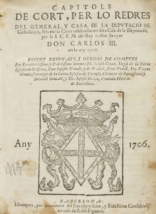 1706. LIBRO: (DERECHO CATALÁN). CAPITOLS DE CORT, PER LO REDRES DEL GENERAL, Y CASA DE LA DEPUTACIÓ DE CATHALUNYA, FETS EN LAS CORTS CELEBRADAS EN DITA CASA... CARLOS III EN LO ANY 1706. Barcelona: Rafel Figuerò, 1706. 8º. 17...