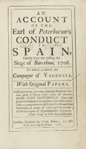 1707. LIBRO: (BARCELONA-GUERRA DE SUCESIÓN). AN ACCOUNT OF THE EARL OF PETERBOROW´S CONDUCT IN SPAIN, CHIEFLY SINCE THE RAISING THE SIEGE OF BARCELONA, 1706.TO WHICH IS ADDED THE CAMPAGNE OF VAELENCIA. Londos: Imp. Jonah...