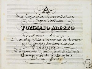 Bagioli Giuseppe Antonio, A / Sua Eminenza Reverendissima / Il Signor Cardinale / Tommaso Arezzo / Meritissimo Principe / di questa Città e Provincia di Ferrara / per il fausto ritornare della sua / legazione... XIX secolo.