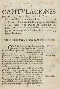 1697. FOLLETO: CAPITULACIONES HECHAS, Y CONCERTADAS ENTRE EL CONDE DE LA CORZANA MAESTRO DE CAMPO GENERAL DEL EXERCITO DE ESPAÑA, Y GOVERNADOR DE LA PLAÇA DE BARCELONA DE UNA PARTE, Y EL DUQUE DE VENDOSME CAPITAN GENERAL DEL EXERCITO DE...