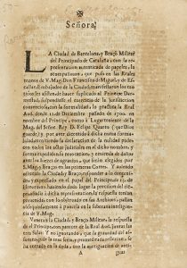 SEÑORA. LA CIUDAD DE BARCELONA... AVER INSTADO A LOS DEPUTADOS CONSTRADIXESSEN A TODOS LOS ACTOS JUDICIALES HECHOS Y DESPACHADOS EN EL REFERIDO NOMBRE. S. imp., 1701. 4º mayor. 12 h.
