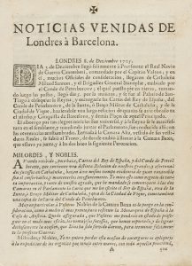 1706. FOLLETO: (BARCELONA). NOTICIAS VENIDAS DE LONDRES A BARCELONA. Barcelona: Rafael Figuero, 1706. 8º mayor. 4 h. [Más:] NOTICIAS GENERAL VENIDAS DE OLANDA A BARCELONA. Id.: id., 1706. 8º mayor. 2 h. [Más:]...