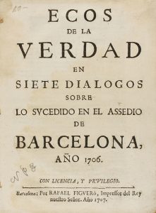 1707. FOLLETO: (BARCELONA-GUERRA SUCESIÓN). ECOS DE LA VERDAD EN SIETE DIALOGOS SOBRE LO SUCEDIDO EN EL ASSEDIO DE BARCELONA, AÑO 1706. Barcelona: Imp. Rafael Figueró, 1707. 8º mayor. 48 p. Texto con apostillas marginales....