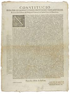 1712-1783. FOLLETO: (BARCELONA). LOTE DE 8 BANDOS. 43 x 32 cm: Constitucio feta per lo sagrat concili provincial Tarraconenses; Hoc est exemplum bene; Nos Don Phelipe por la gracia de Dios rey de Castilla; Jayme Miguel de Guzman;...