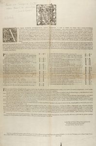 Excelentisim, y Savi Concell de Cent, tingut y celebrat lo dia 19 del mes de Febrer... Bando impreso en folio de 62 x 42 cm. Publicado el 14 de marzo de 1714. Después de la reunión del Consell de Cent del 19 de de febrero de 1714 para regular el precio de los alimentos que estaban subiendo sin control desde que había empezado el asedio en julio de 1713. Escudo heráldico de la ciudad y gran letra capital grabada. Muy raro.