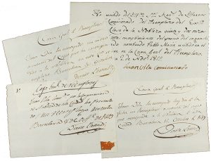 1819. FOLLETO: (BARCELONA-REEMPLAZO). LOTE DE DOS FOLLETOS IMPRESOS Y VARIOS RECIBOS MANUSCRITOS REFERIDOS A LA TASA DE REEMPLAZO DE NOBLEZA DE JUAN VILA. Hay 14 recibos escritos a mano y los dos impresos explican cómo y dónde...