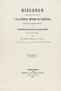 1847. FOLLETO: DISCURSO SOBRE INSTRUCCION PUBLICA Y LOS DIVERSOS METODOS DE ENSEÑANZA, LEDIO EN LA SESION PUBLICA DE LA SOCIEDAD ECONOMICA BARCELONESA DE AMIGOS DEL PAIS DEL 10 DE OCTUBRE DE 1846. Barcelona: Imp. de Tomas Gaspar, 1847....