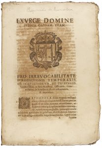 p. Cerco de humedad. [Más:] MARLES Y DE CASADEMUNT, IOSEF: SEGUNDA ALLEGACION IURIDICA. POR EL MUY REVERENDO P. RETOR DEL COLEGIO DE BELEN... Barcelona: Imp. Mathevat, 1685. Folio. 51 p. [Más:] POR EL MUY ILUSTRE FR. DON ARNALDO DE SERRALTA CAVALLERO DE LA SAGRADA, Y MILITAR RELIGION DE S. IVAN, GRAN PRIOR DE CATHALUÑA. & C. SOBRE SI DEVE OBSERVAR EN SUS IGLESIAS LOS ENTREDICHOS PROMULGADOS POR EL ORDINARIO ECCLESIASTICO. Barcelona: S. Imp., 1684. 4º mayor. Grabado xilográfico + 29 p. Señal de humedad y pequeña pérdida de soporte en las primera hojas, afecta el grabado. [Más:] CALDERO, MICHAEL DE: ADDITIO ULTIMA AD DEMONSTRANDUM IMMUNITATE FORI ECCLESIASTICI... [Barcelona:]: impreso finales s. XVII. 2 h. [Más:] POR EL MUY ILLUSTRE CABILDO DE LA SANTA IGLESIA DE BARCELONA. Barcelona: Omp. De Amigant Vic.Gen., 1680. 4º mayor. 24 p. Finas galerías en el margen derecho. [Más:] ILLUSTRISS. Y REVERENDISS. SEÑOR, el canonigo Francisco Valeri... Impreso en 4º. 16 h. con la alegación del cabildo de la Catedral a las albaceas del Canonigo Francisco Valeri.[Más:] DEMONSTRACION PUBLICA, CON FUNDAMENTOS SOLIDOS, EN IUSTIFICACION, DE LOS PROCEDIMIENTOS ECHOS, por la Illust. y M. Reverenda Abadesa del R. Monasterio de S. Pedro de las Puellas de Barcelona... 1678. 4º mayor. 22 p. [Más:] IN CAUSA BARCHINONEN IURIS SEPELIENDI. Impreso en 4º mayor. 1677. 1 h. [Más:] R. P. D. CATALAIV BARCHINONEM IURISDICTIONIS. Romae: Typ. Reu. Camerae Apost., 1679. 4º mayor. 2 h. [Más:] NOS DON AYMUNDUS DE CORTADA ET BRU... [Barcelona:] Impreso en 1747. 4º mayor. 4 h. [Más:] DEMONSTRACION IURIDICA DE LOS IUSTIFICADOS MOTIVOS TUVO EL REVERENDO CARLOS FERRUSSOLA... PARA NO PUBLICAR UN CARTEL QUE SE LE PRESENTO POR PARTE DE LA VENERABLE ABADESSA DEL MONASTERIO DE DICHA IGLESIA DE SAN PEDRO. Barcelona: 1678. 4º mayor. 21 h. [Más:] MEMORIAL EN DRET EN FAVOR DE LA MARE CORRECTORA Y CONVENT DE LAS MONJES MINIMAS DE LA PRESENT CIUTAT DE BARCELONA CONTRA DE FRANCISCO MORA DE MAR Y MON. Barcelona: 1643. 4º mayor. 10 p. [Más:] EXURGE DOMINE IUDICA CAUSAM TUAM PRO IRREVOCABILITATE IURISDICTIONIS TEMPORALIS DD. INQUISITORUM, ET TRIBUNALIS SANCTI OFFICIS IN SUOS MINISTROS, OFFICIALES, COMISSARIOS... Barcelona: 1644. 4º mayor. 12 h.