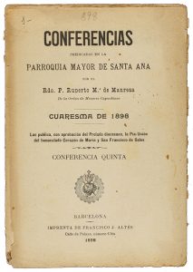 1892. 8º. 39 p. Rústica. [Más:] RUPERTO Mª DE MANRESA: CONFERENCIAS PREDICADAS EN LA PARROQUIA MAYOR DE SANTA ANA POR... Barcelona: Imp. Francisco J. Altés, 1898. 8º mayor. 22 p. Rústica deslucida. [Más:] FIESTAS DEDICADAS A SANTA ISABEL REINA DE PORTUGAL PADRINA DEL PREMIO DE PERFUMERÍA. Barcelona: S. imp., 1945. 4º menor. 2 h. A varias tintas y con grabado de la santa.
