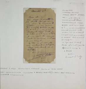 D’Indy Vincent, Cartolina postale 'Carte pneumatique' viaggiata, autografa firmata, inviata al violinista e compositore Armand Parent. Datata 21 marzo 1900 (da timbro postale).