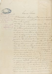 1882. MANUSCRITO: (BARCELONA-MONTJUICH-DERECHO). MANUSCRITO CON SELLO DE CAUCHO DEL GOBIERNO MILITAR DE BARCELONA. 5 folios y dos cuartillas, manuscritas. Todo relativo a unos terrenos que la vecina de Barcelona Magdalena Ventura...