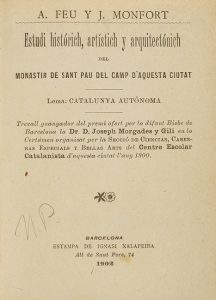 1902. LIBRO: (BARCELONA). FEU, A.; MONFORT, J.: ESTUDI HISTORICH, ARTISTICH Y ARQUITECTONICH DEL MONASTIR DE SANT PAU DEL CAMP D´AQUESTA CIUTAT. Barcelona: Est. de Ignasi Xalapeira, 1902. 12º. 46 p. Rústica.