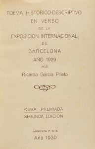1930. LIBRO: (BARCELONA). GARCIA PRIETO, RICARDO: POEMA HISTÓRICO-DESCRIPTIVO EN VERSO DE LA EXPOSICIÓN INTERNACIONAL DE BARCELONA AÑO 1929 POR... Barcelona: Imp. P.C. B., 1930. 4º menor. 135 p. Ilustr. con...