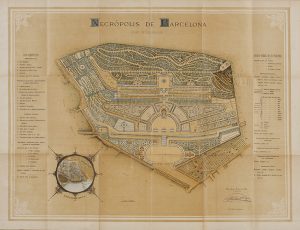 1883 ca. MAPA: (BARCELONA). ALBAREDA, LEANDRO: NUEVO CEMENTERIO DE BARCELONA. Plano de distribución de la nueva necrópolis de Barcelona realizado por el arquitecto Leandro Albareda. Mapa litográfico plegado, 57 x 54 cm....