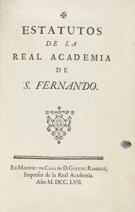1757. LIBRO: (ARTE). ESTATUTOS DE LA REAL ACADEMIA DE S. FERNANDO. Madrid: casa de D. Gabriel Ramirez, 1757. 8º mayor. 102 p., 1 h. Enc. en pergamino. *M03-06.