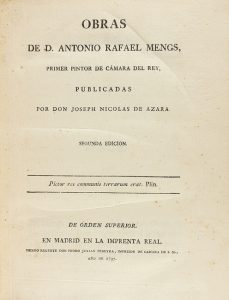 1797. LIBRO: (ARTE). AZARA, JOSEPH NICOLAS DE: OBRAS DE D. ANTONIO RAFAEL MENGS, PRIMER PINTOR DE CAMARA DEL REY. Madrid: Imp. Real, 1797. 4º menor. 6 h. + LII p. + 402 p. Falto del retrato. Enc. en plena piel, nervios,...