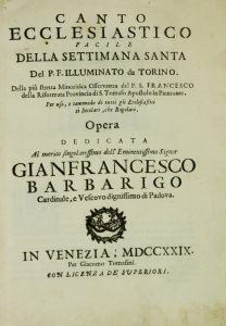 Illuminato da Torino, Canto ecclesiastico facile della Settimana Santa [...] per uso [...] di tutti gli Ecclesiastici sì secolari, che regolari [...] Dedicata a [...] Francesco Barbarigo Cardinale e Vescovo degnissimo di Padova. Venezia: Giacomo...