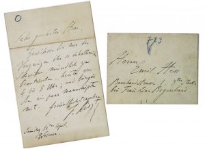 Manoscritto a inchiostro nero. 1 bifolio, scritta 1 pagina. Testo in tedesco. Carta con filigrana. Busta conservata (consegnata a mano). Dimensioni: 176x114 mm. Missiva scritta a Weimar all’allievo, pianista e storico della musica Emil Hess (nato nel 1854). «Mi conceda di rispondere a voce al suo scritto così ricco di contenuti. Oggi dalle 4 alle 5; e si ricordi di portarsi dietro un paio di manoscritti». Hess, che studiò con Liszt a Weimar, divenne insegnante di musica presso la Auersergschen Hause e, per oltre vent’anni, fu virtuoso di camera alla corte del duca di Cumberland.