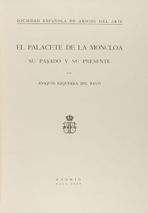 1929. LIBRO: (ARTE). EZQUERRA DEL BAYO, JOAQUIN. EL PALACETE DE LA MONCLOA, SU PASADO Y SU PRESENTE. Madrid: 1929. Folio menor. 30 p., LII láms. Enc. en cartoné, lomo en tela. *M02-14.