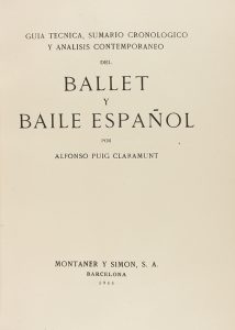 1944. LIBRO: (ARTE). PUIG CLARAMUNT, ALFONSO: BALLET Y BAILE ESPAÑOL. Barcelona: Montaner y Simon, 1944. 4º. 199 p., 2 h. Lám. numeradas, fuera del texto. Enc. plena piel, hierro dorado con la imagen de una bailarina en...