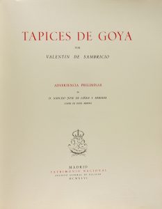 1946. LIBRO: (ARTE). SAMBRICO, VALENTIN DE: TAPICES DE GOYA. Madrid: Patrimonio Nacional, 1946. Folio menor. VII + 303 p., CXCIII láms. Rústica. Edición numerada de 1000 ejemplares en papel con marca de aguas. *M01-03.
