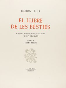 1947. LIBRO: (ARTE-GRABADOS). LLULL, RAMÓN; GRANYER, JOSEP [ilustrador:]. LLIBRE DE LES BÈSTIES. Prólogo Jordi Rubió. Barcelona: Rosa Vera, 1947. 4º mayor. 114 p., 4 h. ilustr. con aguafuertes de Josep Granyer...