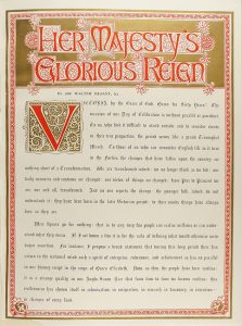1897. LIBRO: (HISTORIA). HER MAJESTY´S GLORIUOUS JUBILEE 1897. THE RECORD NUMBER OF A RECORD REIGN. London: London News, 1897. Gran folio. 46 p. Profus. ilustr. en el texto con grabados adornados con dorados y en orlas...