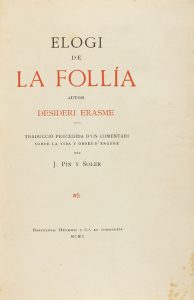 1910. LIBRO: (BIBLIOFILIA-BRUGALLA.). ERASME, DESIDERI: ELOGI DE LA FOLLÍA. Trad. y comentario por J. Pin y Soler. Barcelona: Henrich y Cia., 1910. 8º mayor. Frontis grabado, 2 h. + LV + 197 p. Edición en papel...