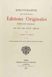 1927. LIBRO: (BIBLIOFILIA). PETIT, JULES LE: BIBLIOGRAPHIE DES PRINCIPALES ÉDITIONS ORIGINALES D´ÉCRIVAINS FRANÇAIS DU XVe AU XVIIIe SIÈCLE. Paris: LIbr. Georges Jeanne, 1927. 4º. 3 h. + 583 p. Rústica....