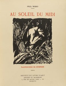 1927. LIBRO: (BIBLIOFILIA). MIRAT, PAUL: AU SOLEIL DU MIDI. Paris: Societe du libre d´ARt, 1927. 4º menor. Edición sin paginar de unas 150 p., ilustr. con grabados de Gabard. Enc. en plena piel, hilos dorados, cantos y...