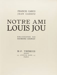 1929. LIBRO: (BIBLIOFILIA). CARCO, FRANCISCO Y JEAN CASSOU. (ILUSTRA LOUIS JOU): NOTRE AMI LOUIS JOU. BIBLIOGRAPHIE PAR RAYMOND COGNIAT. Paris: Imprimeur Couloma, 1929. Folio. 116 p. + 3 h. Ilustrado con grabados en madera...