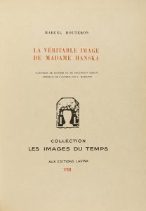 1929. LIBRO: (BIBLIOFILIA). BOUTERON, MARCEL: LA VÉRITABLE IMAGE DE MADAME HANSKA. París: Ed. Alpina, Collecttion Les Images du Temps, 1929. 4º menor. 4 h. Retrato del autor y facsímil de una carta, 98 p., 2 h. Ilustr....