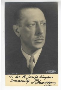 Al recto con inchiostro nero: «To Mr. Joseph Kaiser / sincerly I Strawinsky / 1942». La fotografia riprodotta nella cartolina venne scattata dallo studio Venturini - Via Veneto 108 - Roma. Dimensioni: 140x90 mm. -