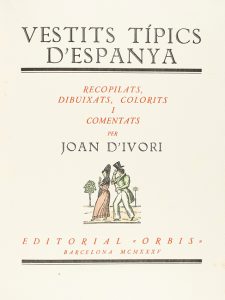 1935. LIBRO: (BIBLIOFILIA-INDUMENTARIA). IVORI, JOAN: VESTITS TIPICS D´ESPANYA. Recopilats, dibuixats, colorits i comentats per... Barcelona: Ed. Orbis, 1935. Folio. 2 carpetas de láminas. Catalunya, Balears i Valencia:...