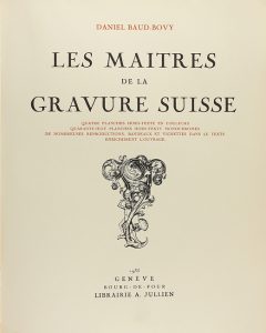 1935. LIBRO: (BIBLIOFILIA). BAUD-BOVY, DANIEL: LES MAITRES DE LA GRAVURE SUISSE. Geneve: Bourg-de-Four, Libr. A. Jullien, 1935. 4º mayor. 204 p. 1 h. + XLVIII lám. y 4 planchas coloreadas denominadas de la A a la D....