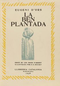 1936. LIBRO: (BIBLIOFILIA-ENCUADERNACIÓN). ORS, EUGENI D´: LA BEN PLANTADA. Barcelona: Llibreria Catalònia, 1936. 4º menor. 142 p., 1 h. Ilustr. por E.-C. Ricart. Ejemplar de la tirada de 10 numerados sobre papel de...