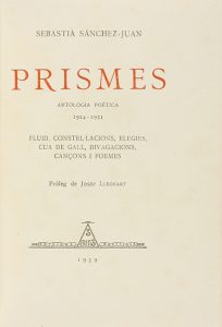 1939. LIBRO: (BIBLIOFILIA). SÁNCHEZ-JUAN, SEBASTIÀ: PRISMES. ANTOLOGIA POÈTICA 1924-1931. Prólogo de Josep Lleonart. Barcelona: Ed. Políglota, 1939. 8º. 126 p., 1 h. Rústica. Numerado y dedicado por el autor....
