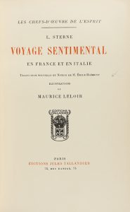 1940 ca. LIBRO: (BIBLIOFILIA). STERNE, LAURENCE: VOYAGE SENTIMENTAL EN FRANCE ET EN ITALIE. París: Ed. Jules Tallandier, s.a. 8º mayor. 212 p., 2 h. Ilustr. con dibujos por Maurice Leloir. Enc. en media piel....