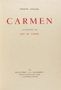 1943. LIBRO: (BIBLIOFILIA). MÉRIMÉE, PROSPER: CARMEN. París: Collection ´la renommée´, 1943. 4º. 146 p., 3 h. Ilustr. con dibujos de José de Zamora. Con seis pruebas de un grabado. Rústica, presentado en funda y...