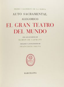 1944. LIBRO: (BIBLIOFILIA-BRUGALLA). CALDERON DE LA BARCA, PEDRO; CAPMANY, RAMON [Ilustrador]: AUTO SACRAMENTAL ALEGORICO. EL GRAN TEATRO DEL MUNDO. Prólogo y anotaciones de Francisco Salva. Barcelona: Hora Luen, 1944....