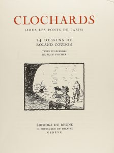 1944. LIBRO: (BIBLIOFILIA). NOCHER, JEAN; ROLAND COUDON (ilustrador): CLOCHARDS (SOUS LES PONTS DE PARIS). Geneve: Ed. du Rhone, 1944. Folio menor. 24 ilustraciones acompañadas de un texto a dos tintas. En rama,...
