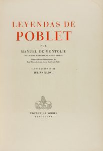 1945. LIBRO: (BIBLIOFILIA-ENCUADERNACIÓN). MONTOLIU, DANIEL DE [NADAL, JULIAN]: LEYENDAS DE POBLET. Barcelona: Orbis, 1945. 4º mayor. VI + 192 p., 5 h. Ilustraciones de Julián Nadal. Enc. en plena piel con hierros secos...