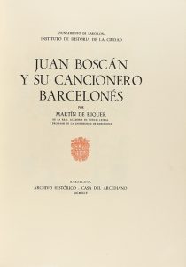 1945. LIBRO: (BARCELONA-BIBLIOFILIA). RIQUER, MARTÍN DE: JUAN BOSCÁN Y SU CANCIONERO BARCELONÉS. Barcelona: Archivo histórico-Casa del Arcediano, 1945. 4º mayor. 236 p., 4 h. Ilustr. con facsímiles. Papel de hilo....