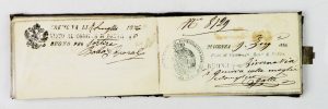 Taccuino contenente i visti dei Commissariati di Polizia per l'entrata e l'uscita dalle zone di Toscana, Milano, Piacenza, Cremona, Torino, Francia. Datato 1855-1857.