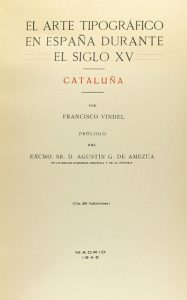 1945. LIBRO: (BIBLIOFILIA). VINDEL, FRANCISCO: EL ARTE TIPOGRÁFICO EN ESPAÑA DURANTE EL SIGLO XV. CATALUÑA. Prólogo de Agustín G. de Amezúa. Madrid: Talleres tipográficos de Góngora, 1945. Folio menor. XIX + 258 p....