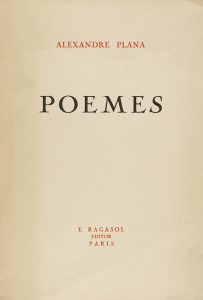 1945. LIBRO: (BIBLIOFILIA). PLANA, ALEXANDRE: POEMES. Soneto de introducción de Josep Maria de Sagarra. París: Ed. E. Ragasol, 1945. 4º menor. 123 p. Ilustr. por Grau Sala, en el texto. Intonso. Rústica. *A07-18.