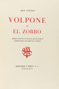 1946. LIBRO: (BIBLIOFILIA-ENCUADERNACIÓN). JONSON, BEN: VOLPONE O EL ZORRO. Trad. Maunuel Bosch Barrett. Barcelona: Ed. Montaner y Simon, 1946. 4º menor. 224 p., 2 h. Ilustrado en el texto por Ramon de Capmany. Edición...