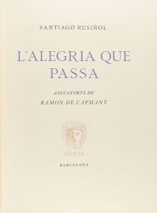 1947. LIBRO: (BIBLIOFILIA-BRUGALLA). RUSIÑOL, SANTIAGO: L´ALEGRIA QUE PASSA. Barcelona: Medusa (Sabadell, Sallent), 1947. Folio. Ilustrado. con 10 AGUAFUERTES de RAMON DE CAPMANY, además de las viñetas y culs-de-lampe....