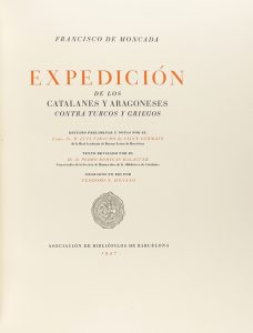 1947. LIBRO: (BIBLIOFILIA-BRUGALLA). MONCADA, FRANCISCO DE: EXPEDICIÓN DE LOS CATALANES Y ARAGONESES CONTRA TURCOS Y GRIEGOS. Estudio preliminar y notas por Luís Faraudo de Saint-Germain. Texto revisado por Pedro Bohigas...