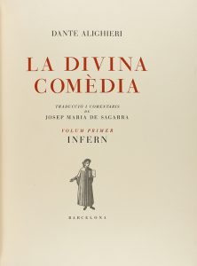 1947-1951. LIBRO: (BIBLIOFILIA). ALIGHIERI, DANTE: LA DIVINA COMÈDIA. Traducción y comentarios de Josep María de Sagarra. Barcelona: Joan Sallent, 1947-1951. 3 vols. en folio. I. Infern: 566 p. Retrato de Dante en...
